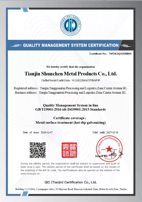 Tianjin Shunchen Industrial Company е натрупала над три десетилетия производствен опит в стоманодобивната промишленост. Компанията притежава сертификати за система ISO 9000, 3A, както и сертификат CE на Европейския съюз и е изградила цялостно оформление на индустриалната верига от обработката на поцинковане до продажбите и дистрибуцията. Чрез строги 12-стъпкови процесни потоци и тристепенен цялостен механизъм за инспекция, компанията е постигнала рекорд от нула годишни аварии по отношение на качеството и безопасността и нула неизпълнение на поръчки за 12 последователни години. Shunchen Industrial поддържа целогодишен токов инвентар от поцинкована стомана от над 20 000 тона, образувайки голям супермаркет от поцинкована стомана, който интегрира складиране и дистрибуция. Складът обхваща площ от 10 000 квадратни метра, осигурявайки солидна подкрепа за интегрираното производство и обслужване на продажбите.