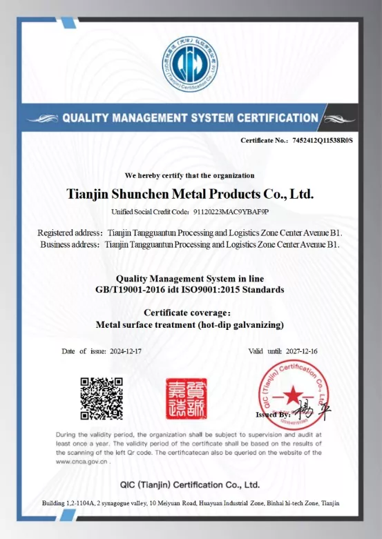 Изберете Shunchen за надеждно качество. Използваме висококачествена стомана Q235B или Q355B, обработена чрез горещо поцинковане за устойчивост на корозия. Температурата на цинковия съд се контролира прецизно в рамките на 450-460 градуса по Целзий, за да се осигури силна адхезия на цинковото покритие и без пропуснати участъци. Нашите продукти отговарят на сертифицирането на системата за качество ISO9001 и са подкрепени от доклади за проверка на цинковото покритие на трети страни.
